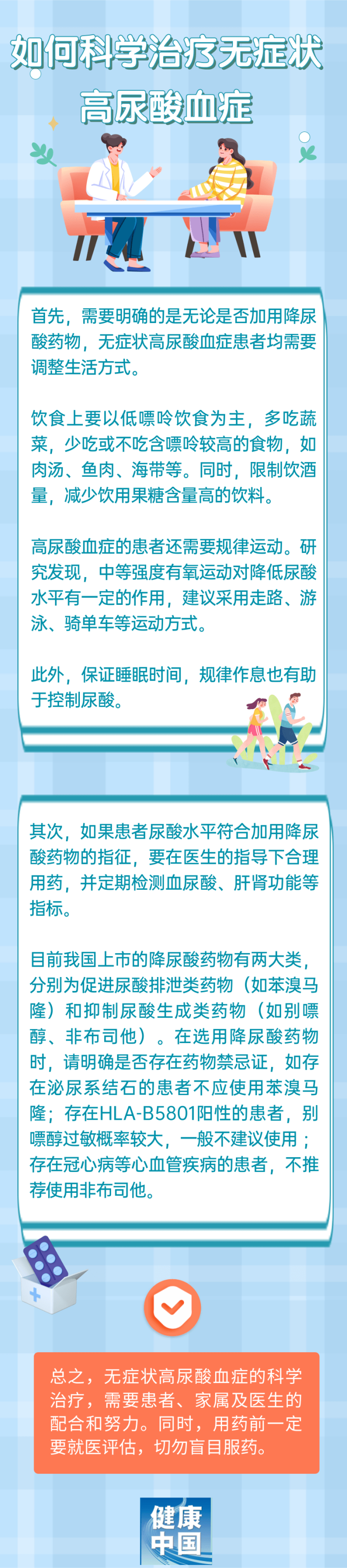 我们应该根据患者的病情进行具体分析,正确掌握无症状高尿酸血症的治疗时机尤其重要。现阶段认为,如果患者存在合并症(如高血压、脂代谢异常、糖尿病、肥胖、脑卒中、心功能不全、尿酸性肾结石等),且血尿酸水平≥480微摩尔/升,或没有合并症,血尿酸水平≥540微摩尔/升时,需要加用降尿酸药物。轻微尿酸升高的无症状高尿酸血症患者,大可不必积极地使用药物降尿酸,可以通过调整生活方式,如控制体重、规律运动,限制酒精及高嘌呤、高果糖饮食的摄入,多饮水等措施来降低尿酸水平。