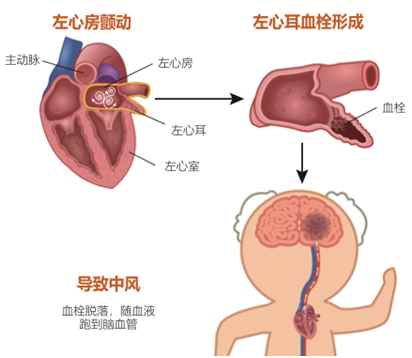 血栓栓塞是房颤最常见最主要的危害,尤其是脑栓塞。房颤时,心房丧失了有效的收缩功能,血液在心房内瘀滞,容易形成附壁血栓。血栓一旦脱落,就有可能顺着血流方向到达脑血管,导致心源性脑梗塞,引起偏瘫、失语甚至昏迷、死亡。左心房有一个附属的心耳结构,它是一个狭长的,弯曲的不规则盲端,90%以上的心脏血栓起源于左心耳。