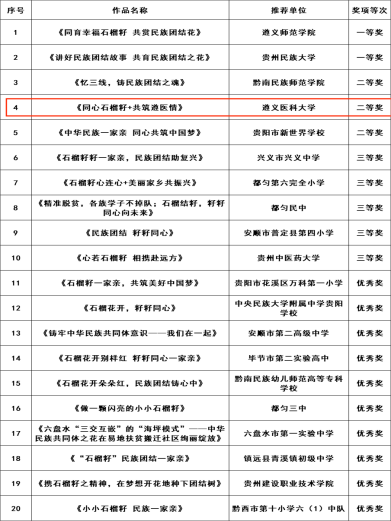 近日,贵州省民族宗教事务委员会、贵州省教育厅、共青团贵州省委员会联合举办了2023年贵州省青少年铸牢中华民族共同体意识教育实践活动。遵义医科大学2021级口腔医学3班孙雪芹同学的主题团课《同心石榴籽+共筑遵医情》在“石榴籽一家亲”主题团队课评选比赛比赛中荣获二等奖。