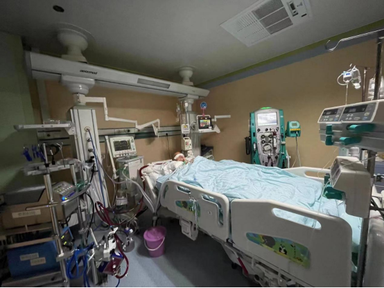 凌晨一点半,一名因心衰转诊贵阳市妇幼保健院的患儿婷婷(化名)被送往贵阳市妇幼保健院重症监护室。只见患儿在呼吸机辅助通气下,面色、口唇青灰、氧合差、心音低钝,急查血提示N端-B型钠利肽前体、及肌钙蛋白均异常增高,心电图、心脏b超提示异常,均指向心力衰竭、心源性休克,高度考虑暴发性心肌炎。进入PICU约15分钟,患儿出现心率、血压下降,经皮血氧饱和度不能维持,医务人员立即进行胸外心脏按压,大剂量血管活性药物维持循环等抢救治疗后,气管插管内仍可见鲜血涌出,心率、血压、血氧难以维持,血流动力学极不稳定,患儿命悬一线,情况非常危急。
