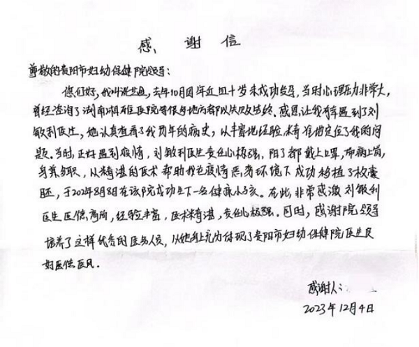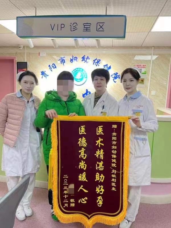 近日,谭女士来到贵阳市妇幼保健院生殖中心亲手将一封感谢信和一面锦旗交到刘敏利主任的手中。她激动地说:“生殖中心医护人员给我的人生和家庭带来了新的希望,在最艰难的时光,感谢你们给予了我最温暖的陪伴和鼓励,将这个小天使送入我的生命。”