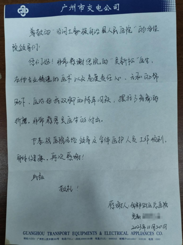 患者张某,男,因双侧踝、足疼痛6年,行走时疼痛剧烈,给日常生活带来了很大困扰,多年来转辗各大医院诊治效果均不佳,在南部战区总医院高压氧康复科经吴新松医生行多次针灸治疗后,疼痛症状得到了明显改善。该患者为表示感谢,特为吴新松医师写了一封感谢信。