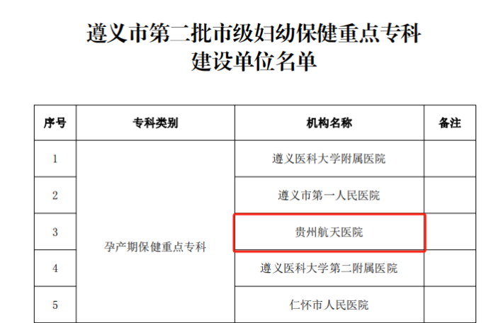 近日,市卫生健康局下发《关于确定第二批市级妇幼保健重点专科建设单位的通知》,贵州航天医院产科获批市级“孕产期保健”重点专科建设项目。