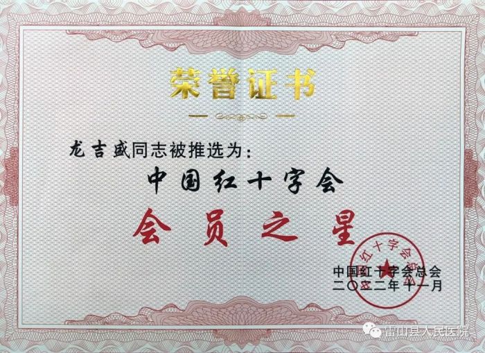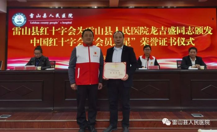 近日,中国红十字会总会表彰一批全国先进典型,雷山县人民医院副院长龙吉盛荣获中国红十字会“会员之星”,雷山县红十字会党组书记、常务副会长余福为龙吉盛颁发中国红十字会“会员之星”荣誉证书。