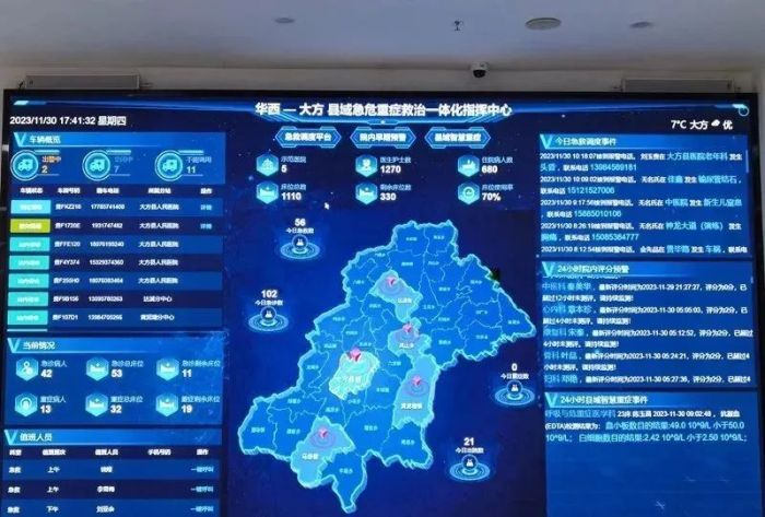 全县数据一屏统揽、精准调度,华西-大方 县域急危重症救治一体化指挥中心集院前急救、危重症监护转运、院内重症早期预警、院内外远程重症监护等功能于一体,实现急危重症患者医疗救治快速高效。