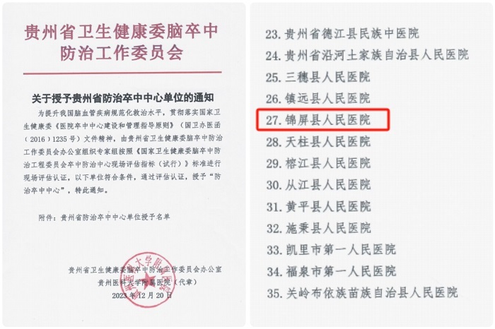 喜报!锦屏县人民医院卒中中心获省级授牌