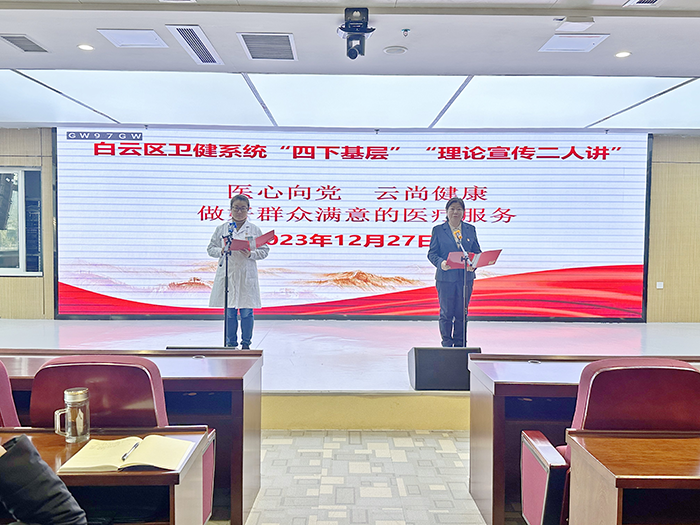 12月27日,白云区卫生健康系统“四下基层”“理论宣传二人讲”活动在白云区人民医院召开。医院中层及以上干部、中共党员、团员、35岁以下青年80余人参加。