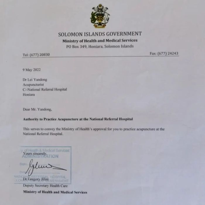 经过两批援所罗门群岛中国医疗队的共同努力,中医针灸已被纳入《“所罗门群岛康复战略计划2022-2031”和“所罗门群岛残疾人包容发展政策2023-2031”》。计划明确指出,未来十年,将培育一名所国当地高级别中医针灸医生和一名中级中医针灸医生。