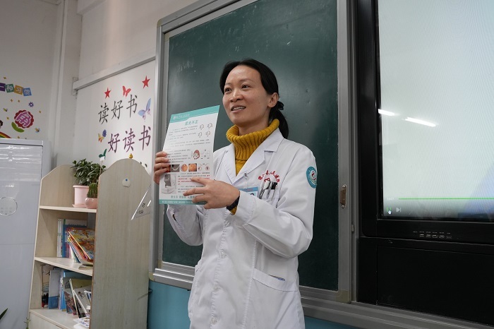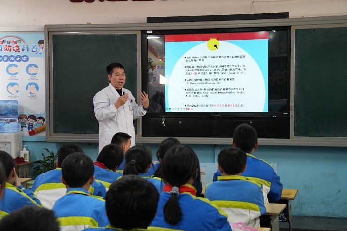 仪式结束,专家们分别前往教室开展健康授课。课上,他们结合自己的专业知识和实践经验,用通俗易懂的语言为学生们讲授了预防和应对运动损伤、呼吸道病毒、屈光不正和弱视、脊柱侧弯等问题的知识和技巧,以及预防和应对方法,学生们受益匪浅。