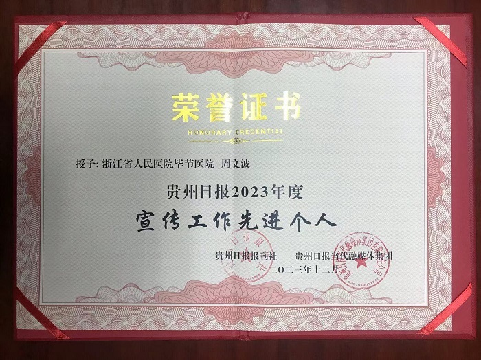 近日,笔者从贵州日报报刊社、贵州日报当代融媒体集团获悉浙江省人民医院毕节医院(以下简称“浙毕医院”)获“贵州日报2023年度宣传工作先进集体”,宣传统战科科长周文波获“贵州日报2023年度宣传工作先进个人”。