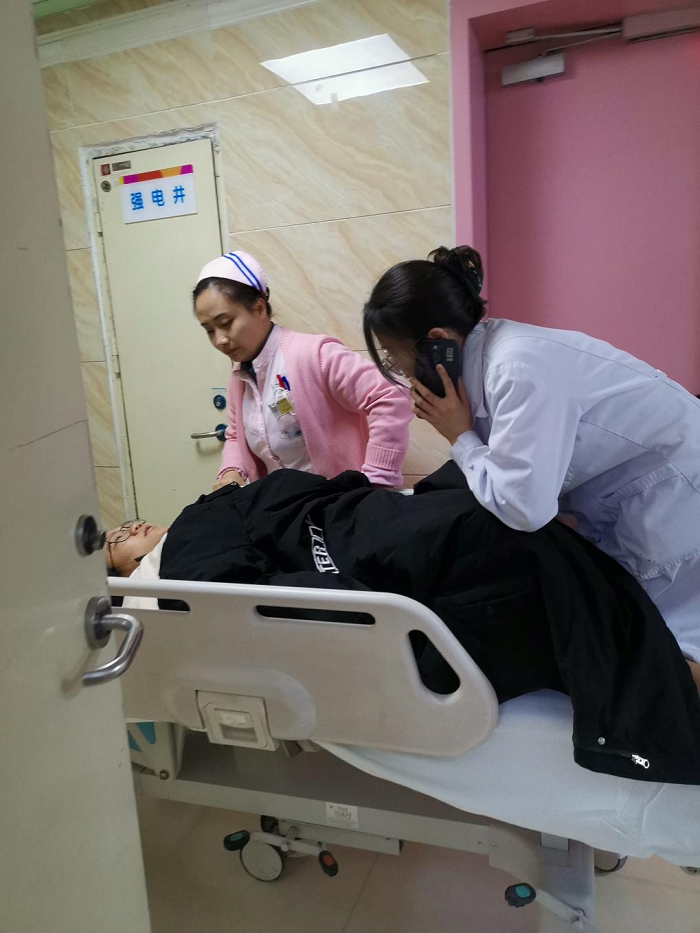 值班护士王茜和医师陈甜在接到求助后迅速准备好平车,对产妇立即进行阴道消毒检查,此刻胎心仅有80—90次/分,且胎儿双足先露,脐带脱垂,情况十分危急。