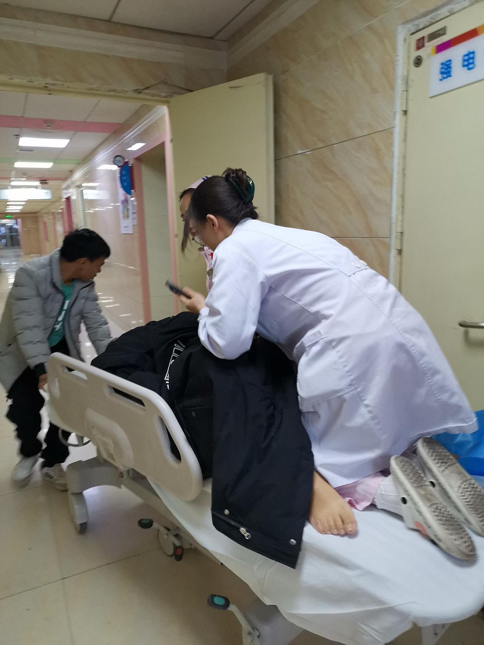 陈甜医师跳上平车托起胎先露、护士王茜及家属迅速转运患者