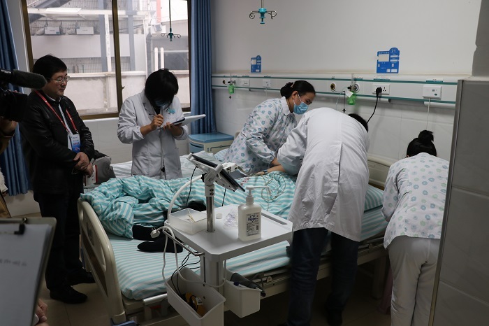 随后,专家组来到胸痛中心核心科室进行现场考核,对胸痛中心建设的运作体系、指引标识、流程制度执行情况进行实地查看。随机提问了医护人员、导诊、保洁、保安人员关于胸痛患者的急救电话、就诊流程指引等应知应会。并对胸痛患者救治模拟演练中的各个环节进行严谨高效地审查。