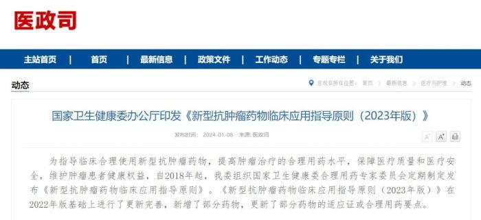 近日,国家卫健委印发《新型抗肿瘤药物临床应用指导原则(2023年版)》。《原则》指出,抗肿瘤药物的应用涉及临床多个学科,合理应用抗肿瘤药物是提高疗效、降低不良反应发生率以及合理利用卫生资源的关键。具体通知如下: