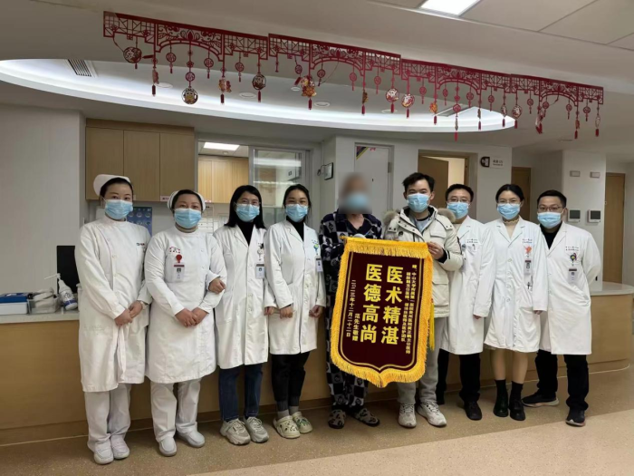 患者携家属亲自将锦旗交到龚正鹏手里,激动的说到“真心感谢龚主任、胡跃副主任、谭诗丝医师的专业负责,感谢护理团队每一位白衣天使的日夜精心护理及照顾,让我能够多次战胜病魔”。