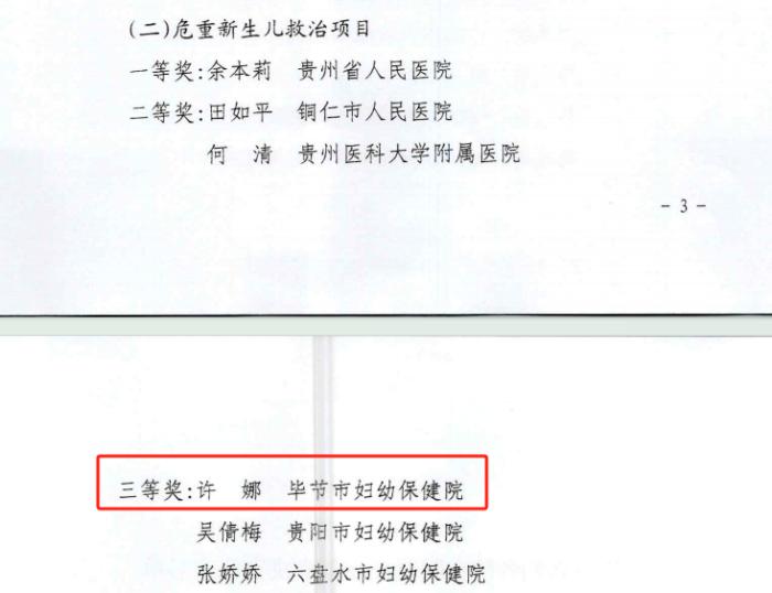 日前,毕节市妇幼保健院代表毕节市参加在省卫生健康委、省总工会联合举办的“贵州省妇幼健康职业技能竞赛决赛”活动中取得优异成绩,分别获宫颈癌防治项目一等奖、儿童眼保健项目二等奖和危重新生儿救治项目三等奖。