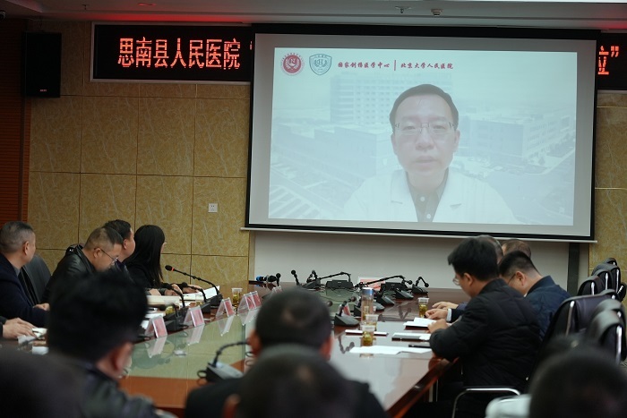 签约仪式上,北京大学人民医院副院长王天兵教授通过线上方式向会议致辞。并表示,思南县人民医院加入中国创伤救治联盟是提升创伤救治水平的重要途径,也标志着医院在创伤救治方面正式迈入规范、快速的发展轨道,为区域百姓提供重要医疗保障。医院将以此为契机,集中整合优势力量,优化救治流程,着重打造涵盖院前急救、急诊、手术、ICU、病房、康复于一体的区域高水平创伤救治中心,为提升思南县创伤救治能力、推动区域创伤救治体系建设作出贡献。
