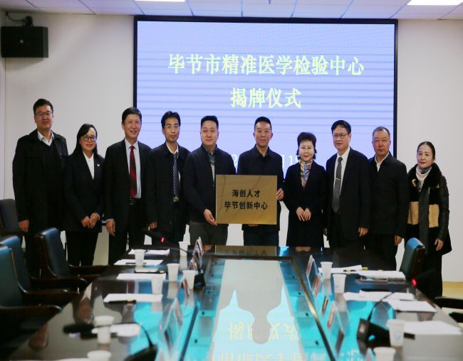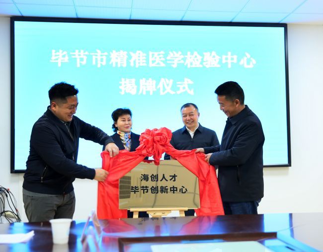 在民革贵州省委秘书长李云霞和毕节市政协副主席、民革毕节市工委主委肖远福的共同见证下,广东国盛医学科技有限公司邓杏飞博士、刘向阳博士、海创人才南方创业服务中心副秘书长、毕节市第二人民医院医院院长王刚、毕节市第三人民医院院长李珍武共同为“广东国盛医学精准中心毕节检验中心”、 “海创人才毕节创新中心”共同揭牌。