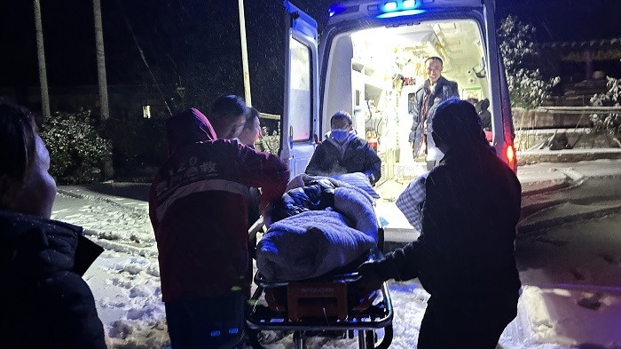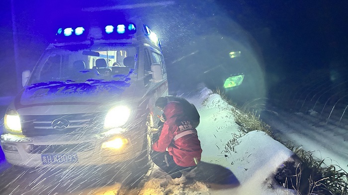 医护人员及时检查凝雪路面及救护车行驶情况,确保患者安全