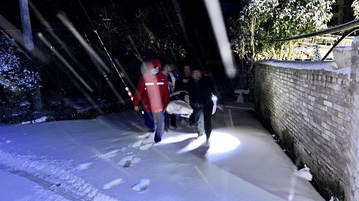“霜严衣带断,指直不得结”。由于患者病情紧急,为争取时间,在确保安全的情况下,救护车克服风雪飘飞、路面湿滑等因素加速飞驰。行驶过程中,遇到积雪深厚,车辆难以通过的路段,出诊队员当机立断,紧密合作,下车清理积雪,合力推车,尽最快的速度前往患者家中。