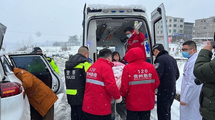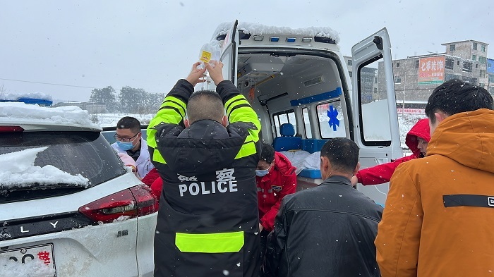 贵州岑巩:老人摔伤积雪封路 警医协作接力护送就医