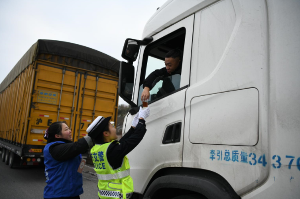 驾驶员王辉说:“路面上有冰走不了,交警封路也是为了我们好,心里面不冷,工作人员给我们送了泡面和姜茶,心里面暖。”