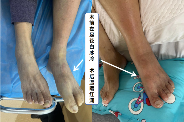 手术后患者左下肢的温度已经暖和,颜色也逐渐红润起来,经过两天的溶栓治疗后,患者下肢的血管基本通畅,缺血的症状得到了显著的改善。