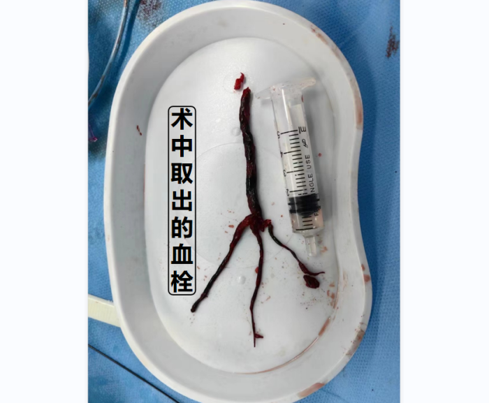 情况危急,安天志评估患者病情后决定立即为患者实施取栓手术。术中造影发现膝部以下动脉主干全堵了,于是切开左侧的股动脉,使用球囊在下肢动脉主干拖出大量血栓,然后抽吸出主干残留的血栓,最后发现左足远端血管内还有少量血栓,于是留管溶栓。