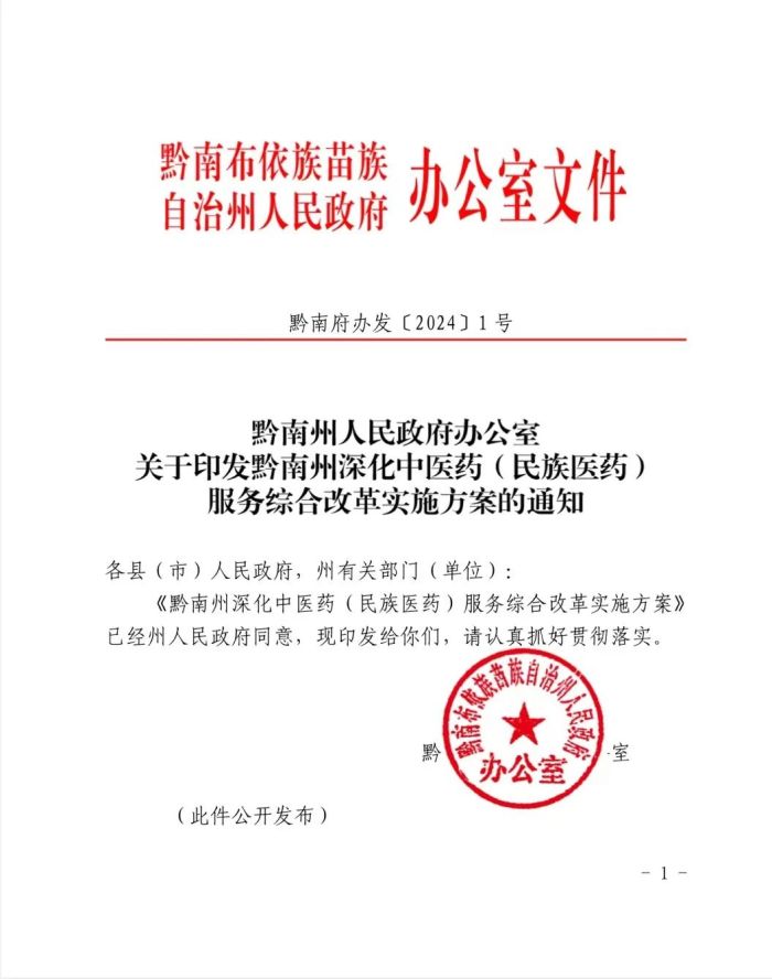 近日,黔南州人民政府办公室印发《黔南人民政府办公室关于黔南州深化中医药(民族医药)服务综合改革实施方案的通知》(黔南府办发[2024]1号)文件,创新提出8条具体措施深化中医药(民族医药)服务综合改革,推进黔南州中医药(民族医药)事业和产业高质量发展。