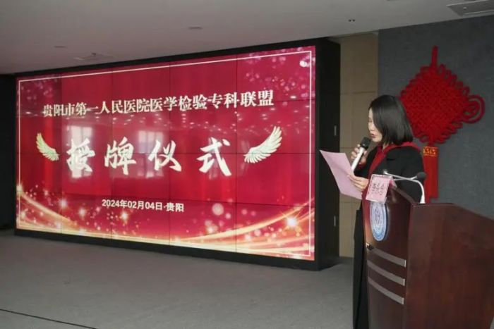 为进一步推动优质资源下沉,全面提升基层临床医学检验水平,经省、市卫健委批准,贵阳市第一人民医院医学检验专科联盟于2024年2月4日正式成立。贵阳市一医党委书记李永念,副院长杨光辉、江蕾微,以及20家专科联盟成员单位领导及检验科主任出席授牌仪式。仪式由贵阳市一医副院长江蕾微主持。