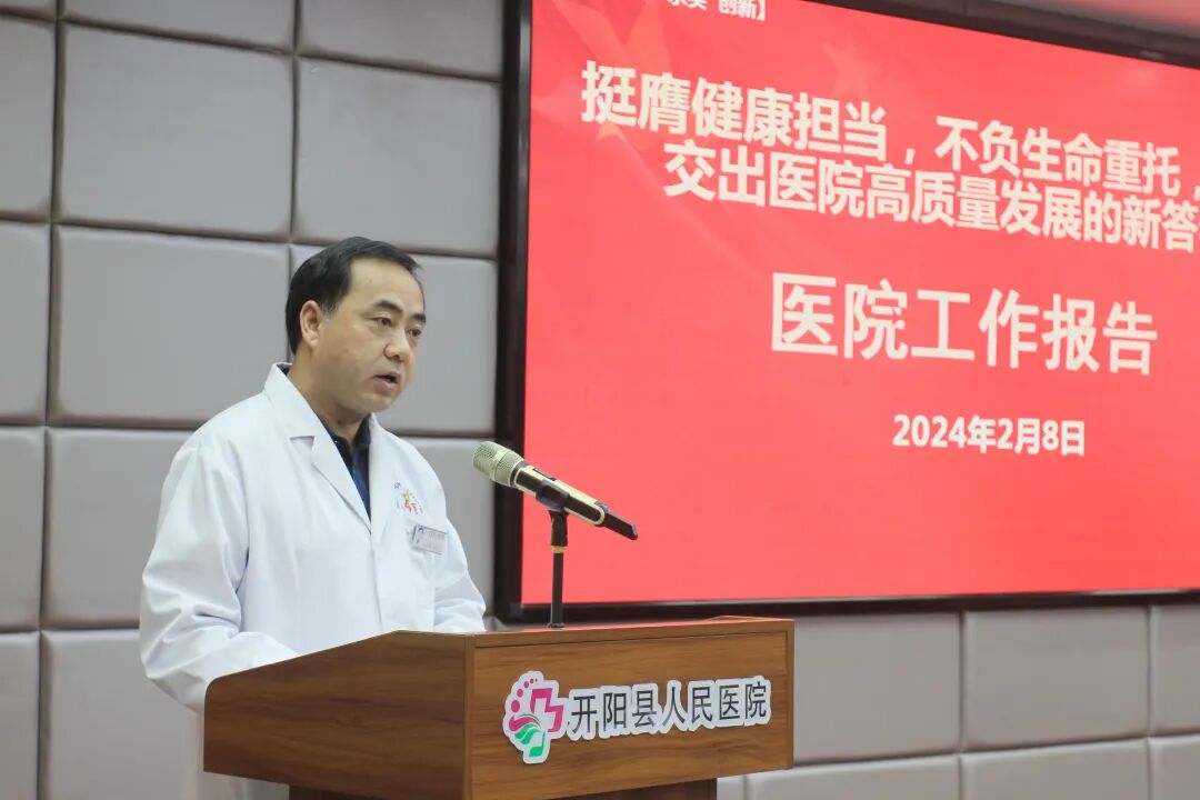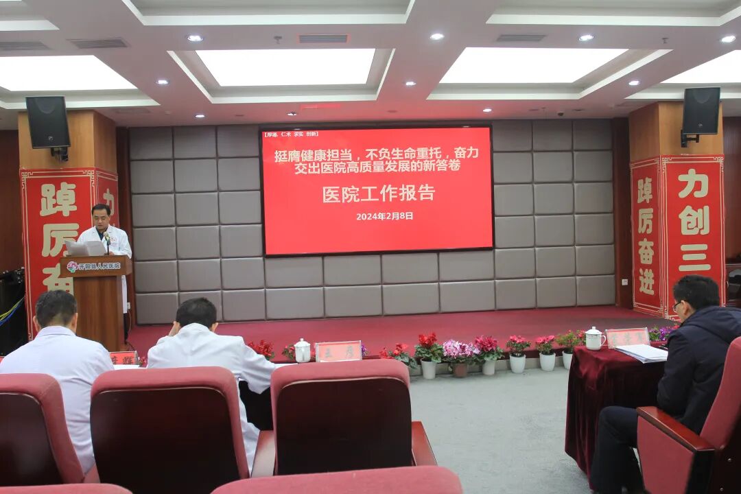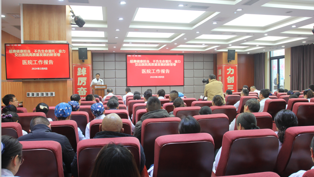 报告对2024年工作进行了部署。报告指出,2024年是实现“十四五”规划目标任务的关键一年,医院将以三级医院创建和综合能力提升年为导向,持续深入学习贯彻党的二十大精神,认真落实党和政府赋予的职责与使命,推动新时代医院党建与业务工作深度融合,以高质量党建引领高质量发展。一是坚守医疗质量和安全生产底线,着力营造平安医院的良好环境;二是强化精细管理,推进各项医疗工作流程、医疗质量与安全、核心制度落实标准化和常态化;三是深入实施清廉医院创建行动,努力打造党风清正、院风清朗、医风清新的清廉医院,始终保持良好社会形象,推动医德医风、行业作风全面向好。新的一年,医院希望全院干部职工凝聚精神内核,携手同心,努力拼搏,以遇水搭桥、逢山开路的冲劲、闯劲和拼劲,在三级医院创建中,同心同德、攻坚克难,以奋斗的姿势回应新时代的召唤,以赶考的心态、战斗的状态、奔跑的姿态,铆足闯的劲头,鼓足拼的气势,下足干的功夫,迎着龙行龘龘的曙光,肩负百姓就医的新期盼,加快推动医院高质量发展,在奋力谱写三级医院创建和健康开阳建设的新篇章中,彰显新担当,展现新作为,成就新未来,以优异的成绩向新中国成立75周年献礼。