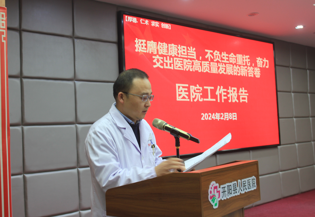 会上,党委副书记、院长熊成锦作《挺膺健康担当,不负生命重托,奋力交出医院高质量发展的新答卷——开阳县人民医院2023年度工作总结及2024年度工作计划》报告。他指出,2023年,是全面贯彻党的二十大精神开局之年,是三年疫情防控转段经济恢复发展的一年,医院坚持以习近平新时代中国特色社会主义思想为指导,深入开展主题教育。在县委县政府及市县卫健局的正确领导下,全院干部职工凝心聚力,攻坚克难,衷心拥护“两个确立”,忠诚践行“两个维护”,紧密围绕县级公立医院党的建设,聚焦千县工程“二十大中心”建设,聚焦改善患者就医感受“国二十条”,着力在临床服务五大中心建设、急诊急救五大中心建设、现代医院管理、智慧医院建设、精细化管理、提质增效、市委巡察整改等方面持续发力,不断夯实高质量发展内涵,助推医院发展再上新台阶,圆满完成一年的工作任务。报告指出: 2023年,准确把握目标定位,深入聚焦提质增效,党建引领医院高质量发展跃上新台阶,一是夯实医疗安全目标管理,医疗服务质量创出新成绩。二是着力推进“千县工程”二十大中心建设,综合服务能力凸显新成效。狠抓急诊急救“五大中心”建设、“胸痛中心”通过国家(基层版)认证,创伤中心列入县级2024年“十件民生实事”,同时强力推进临床服务五大中心建设、资源共享“五大中心”建设和高质量管理“五大中心”建设,综合服务能力凸显新成效。三是认真落实国家新医改政策,现代医院管理再显新作为。持续推进智慧医院建设,信息化建设取得新突破,DIP付费取得新进展; 四是深入开展“我为群众办实事”。紧扣改善就医感受“国二十条”与医院中心工作、重点任务及乡村振兴有机结合,门诊移动支付服务、床旁结算一站式服务等一系列实事破题见效,患者就医体验明显改善,满意度持续提升。认真落实县委关于乡村振兴工作要求,做好脱贫攻坚健康扶贫成果同乡村振兴有效衔接工作,同时做好党的统一战线及群团工作:抓好同心驿站阵地建设,切实用智慧和行动擦亮开医“同心驿站”品牌。五是落实有效举措,节能降耗、安全生产凸显新作为,认真落实安全生产“一岗双责”,全年无院感爆发事件、无重大安全生产事件、无泄密事件发生。六是深耕优质服务体系,医院综合实力再绘新蓝图。医院成功入选“中国创伤救治联盟创伤救治中心建设单位”,并列入国家“百县十万人肿瘤筛查公益行动”合作单位、国家“县域肿瘤防治中心建设单位”、中国县域医院出血中心联盟单位。荣获贵阳市2023年“无废医院”创建单位。
