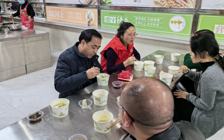 医院党委副书记、院长熊成锦,党委委员、副院长王金菊与职工们一起品尝新年饺子。