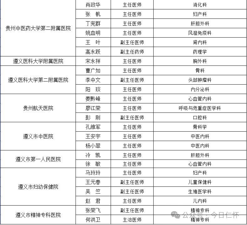 重庆医科大学附属第二医院、遵义医科大学附属医院、遵义医科大学第二附属医院、遵义市精神专科医院、北京积水潭医院贵州医院、贵州中医药大学第一附属医院、贵州中医药大学第二附属医院、广东省中医院贵州医院、贵州航天医院、遵义市中医院、遵义市第一人民医院、成都市妇女儿童中心医院、遵义市妇幼保健院等。