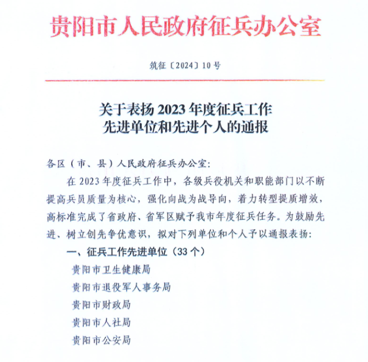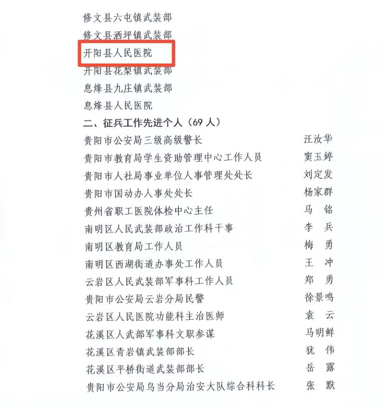 首页 > 新闻中心 > 卫生工作动态 > 正文 开阳县人民医院荣膺“贵阳市征兵工作先进单位” 来源:贵州健康报 时间:2024-03-02 浏览次数: 近日,据贵阳市人民政府征兵办通报,开阳县人民医院荣膺“2023年度贵阳市征兵工作先进单位”。开阳县人民医院至开展征兵工作以来,连续40年未出现退兵现象,为部队输送了无数优质的兵员,为加强国防军队建设、为征兵体检工作做出积极贡献。在县武装部、县卫健局指导下,医院每年精心筹备征兵体检工作,集全院资源力量,从心内科、普外科、骨科、体检中心、医学科影像、超声医学科、眼科、检验科、神经内科、医务科等科室精心选调30余名政治素质高、业务能力强、工作经验丰富的主要科目体检医师和具有高级职称或学术带头人承担征兵体检工作任务,围绕“合格兵员”这个核心,按照征兵工作要求,严格按照“六谁(谁主管、谁负责,谁体检、谁结论,谁签字、谁负责)”的岗位责任制,牢固树立“一盘棋”的思想和大局意识、协作意识、责任意识,实现“一切行为有标准,一切操作有记录,一切过程可监督,一切差错可追溯,一切责任可追究”,同时与体检组成员签订《廉洁征兵责任状》,并对专业组体检医生在岗培训和业务考核。此外,医院还积极总结征兵体检工作经验,组成更加科学、全面的征兵队伍,严格执行征兵体检标准,保质保量的完成每年的征兵工作任务,为实现中华民族的强军梦作出应有的担当和奉献。开阳县人民医院将始终把征兵体检作为一项政治任务,精心组织、严把标准,同时积极做好拥军优属工作,对军人、退役军人、武警、消防救援人员专设优先服务窗口,全面落实现役军人及家属和退役军人优先就诊政策,多方面支持服务辖区征兵体检工作。(来源:开阳县人民医院)编 辑:周 岩二 审:龙昭汀三 审:龙 艳 分享到: