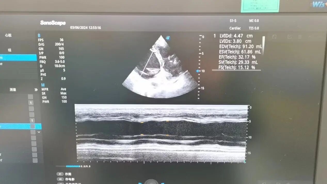 3、心脏超声:左室舒张期末内径LVEDD 73mm (正常<55mm),左室收缩期末内径LVSD 63mm (正常<35mm),EF(射血分数)35%,左室壁收缩活动节段性减低,左室收缩及舒张功能减低。