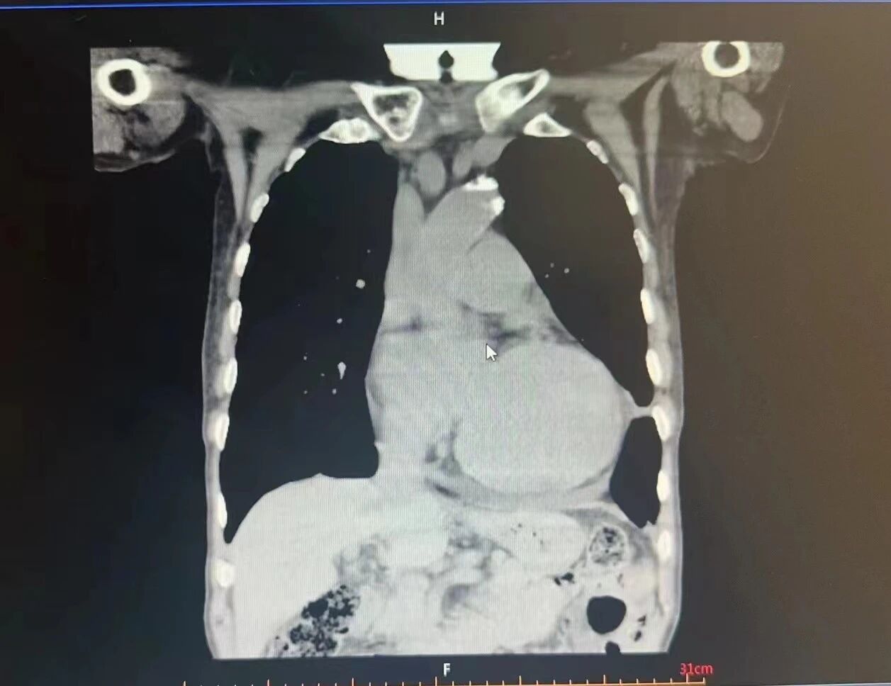 2、胸部CT:(1)双肺多发结节,转移瘤?请结合临床;(2)右肺上下叶及左肺渗出,双侧胸腔少量积液;(3)左侧上叶少许间隔旁型肺气肿;(4)心脏增大,肺动脉增粗,心包少量积液;(5)右侧第7及左侧第3、4肋、胸骨改变,转移?请结合临床。