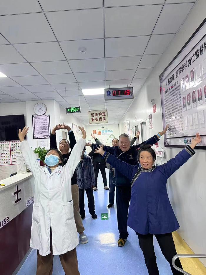 随后,为了促进患者及家属的身心健康,增强他们的体质和免疫力,医护人员邀请患者及家属共练八段锦。八段锦作为一种古老而有效的健身方法,既能够调和气血、舒筋健骨,又有助于放松心情、缓解压力,非常适合患者及家属共同参与。