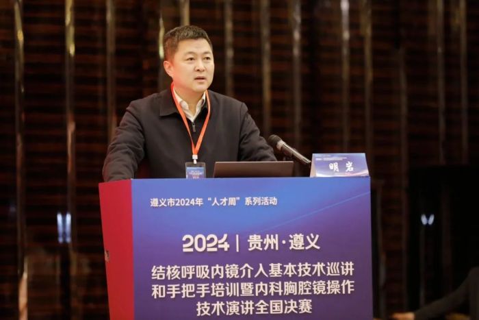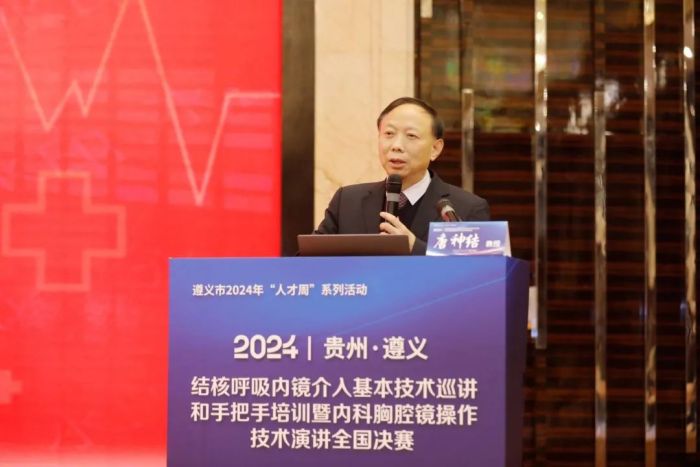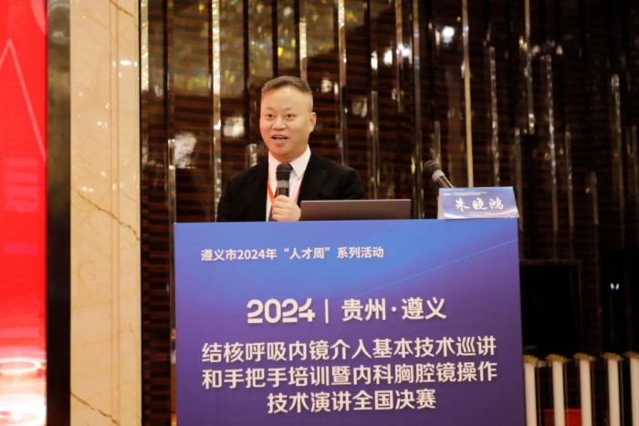 遵义市人民政府党组成员、副市长明岩,遵义市卫生健康局党委书记、局长刘勇,中华医学会结核病学分会主任委员、中国CDC结核病防治临床中心、北京市结核病胸部肿瘤研究所、首都医科大学附属北京胸科医院结核病临床医学中心主任唐神结教授,中华医学会结核病学分会侯任主任委员、国家感染性疾病临床医学研究中心副主任、深圳市第三人民医院肺病医学部主任卢水华教授,中国防痨协会常务理事、中国防痨协会基层分会副主任委员、贵州省疾病预防控制中心副主任、贵州省防痨协会理事长雷世光教授,中华医学会结核病学分会副主任委员、贵州省结核病学分会主任委员杜娟教授,中华医学会结核病学分会呼吸内镜介入专业委员会主任委员、首都医科大学附属北京胸科医院内镜诊疗中心主任丁卫民教授,中华医学会结核病学分会呼吸内镜介入专业委员会主任委员、北京中医药大学东直门医院呼吸病中心主任王洪武教授,空军军医大学肺部疾病研究所所长、全军呼吸内科专科中心主任金发光教授,中国医师协会呼吸医师分会介入工作委员会胸膜疾病学组副组长、南方科技大学医院呼吸介入中心主任周红梅教授,贵州航天医院党委书记朱晓鸿,贵州航天医院党委副书记、院长姜黔峰,贵州航天医院副院长、遵义市呼吸内科专业医疗质量控制中心主任委员廖江荣出席会议。来自北京、上海、广东、新疆等省内外60余位知名专家,以及结核呼吸内镜介入手把手培训班学员、全国内科胸腔镜操作技术决赛参赛选手参加会议。会议由贵州航天医院党委副书记、院长姜黔峰主持。