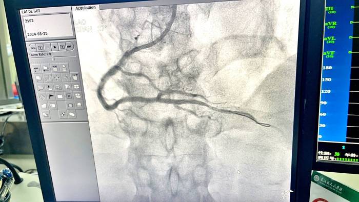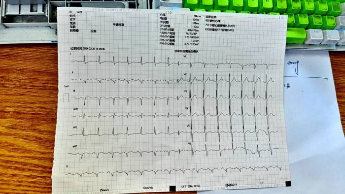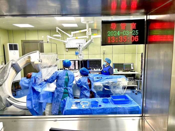 3月25日12:25左右,61岁的蔡大伯因“胸部闷痛3小时”到谷硐中心卫生院就诊,接诊医生12:27完成首份心电图检查,并将心电图上传至麻江县人民医院胸痛中心微信群,麻江县人民医院院长、胸痛中心主任张月仁及时给出回复:急性下壁心肌梗死,建议立即服用“心梗一包药”,并远程指导卫生院进行快速转诊,县医院急诊救治队伍快速响应出诊,做好对接,胸痛中心同时启动导管室,准备手术。