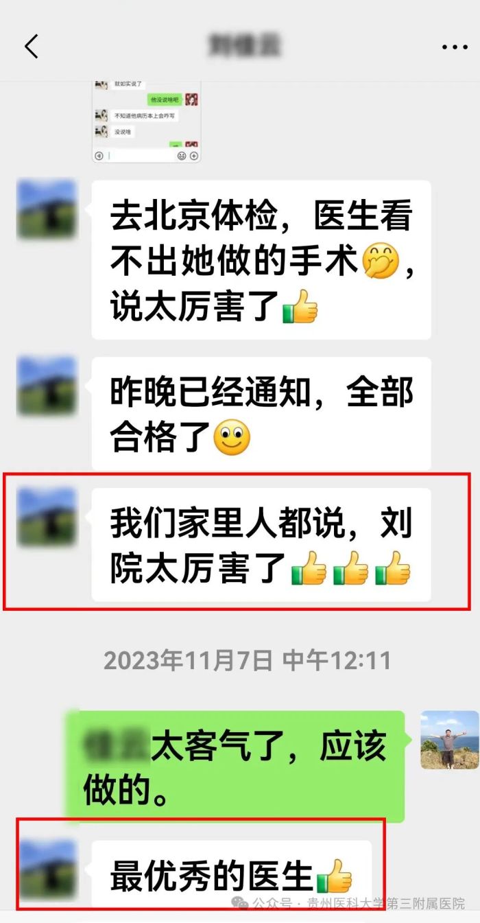 凭借精湛医术,刘兴贵收获了大批“粉丝”,如跨越1528公里的前来就诊程先生、跨越300多公里古伯伯、辗转省内外多家知名医院的任先生……刘兴贵到三附院任职的2年多的时间里,贵阳、黔南、黔东南、毕节、铜仁、六盘水等地的患者纷纷慕名前来就医。75岁的程大爷在接受手术前,直言“刘院长,你在我就踏实了”。