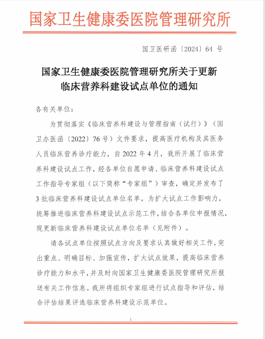 近日,国家卫生健康委医院管理研究所公布更新临床营养科建设试点单位名单,贵州航天医院临床营养科成功入选,获批试点方向:综合临床营养服务模式探索。