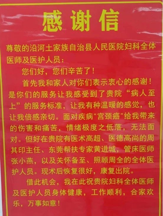 患者曾某某,54岁,因“宫颈癌IBI期”前来沿河土家族自治县人民医院妇科治疗,入院后沿河土家族自治县人民医院妇科主任、副主任医师周其印,东莞帮扶专家、主治医师黄进城,积极组织妇科团队对患者病情进行全面详细检查及评估,经征得患者及家属同意后,决定实施“腹腔镜下广泛全子宫切除术+双侧输卵管切除术+双侧卵巢切除术+盆腔淋巴结清扫术+盆腔粘连松解术”治疗。术后,在医护人员的精心护理下,患者恢复良好,对治疗效果表示非常满意,并向妇科医护人员赠送锦旗及感谢信表示感激之情。
