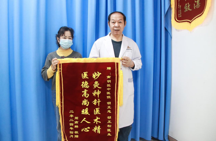 如今,周女士已经能够正常走路,生活质量得到了显著提升。她表示,这都要归功于两位胡老师的精湛医术和细心治疗。为了表达感激之情,周女士特意制作了锦旗,并送到胡医生的手中。