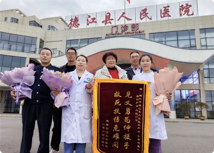 4月8日,当日得到紧急救治的彭大姐和家属一道从毕节市大方县驱车300余公里专程来到德江县人民医院向主动施救的医护人员送锦旗,表达救命之情,赞赏德江县人民医院医护人员医者仁心、大爱无疆高尚品格。