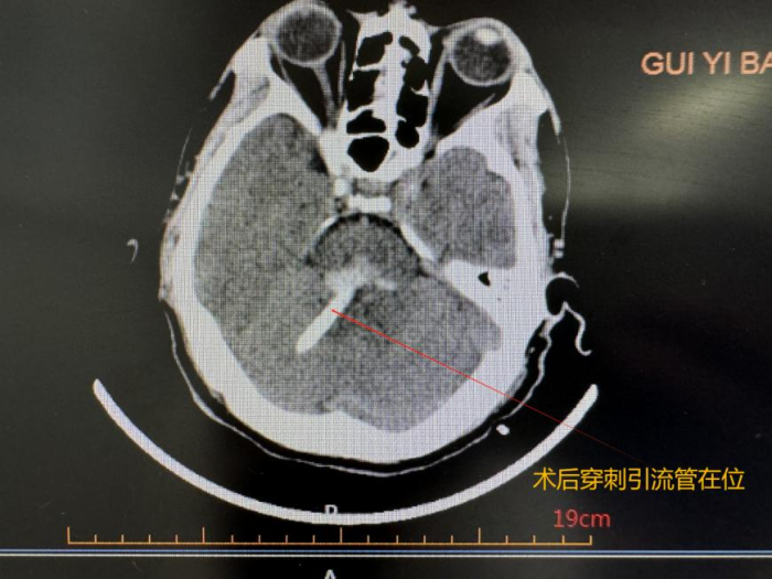 手术过程中,神经外科医疗团队紧密协作,利用先进的影像技术,穿刺点精准定位,一击成功,直达脑干血肿部位,然后通过微小的穿刺通道,将血肿内的积血引流出来,最大限度地减少了对患者脑组织的损伤。