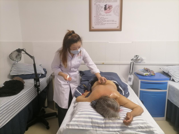 图为治未病科护士长杨芳灵为群众做铜砭刮痧治疗