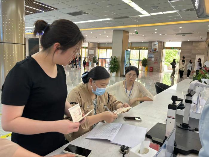 现场,窗口三名群众正在办理延续证明,金砚、张清陪同群众办理,办理时长缩短至几分钟,群众反映现场办理业务证明十分便利。