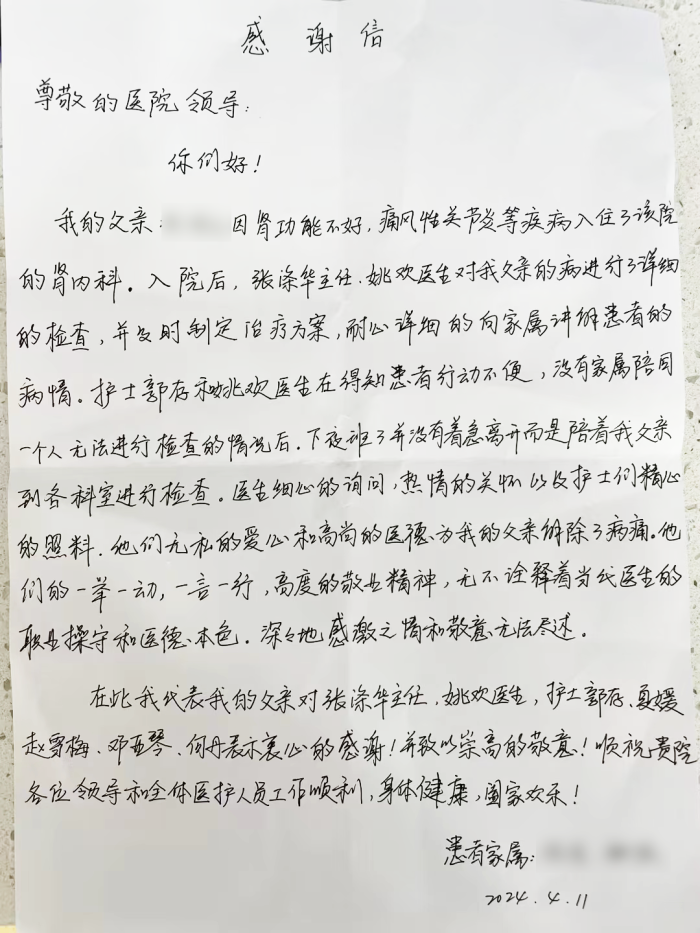 “我父亲因肾功能不好,痛风性关节炎等疾病入住了中山一院贵州医院肾内科。入院后,张涤华主任、姚欢医生对我父亲的病进行了详细的检查,并及时制定治疗方案,耐心详细的向家属讲解患者的病情,郭存护士和姚欢医生在得知患者行动不便、没有家属陪同,一个人无法进行检查的情况后,下夜班了并没有着急离开,而是陪着我父亲到各科室进行检查。医生细心的询问,热情的关怀以及护士们精心的照料,他们无私的爱心和高尚的医德为我的父亲解除了病痛。他们的一举一动,一言一行,高度的敬业精神,无不诠释着当代医生的职业操守和医德本色,深深地感激之情和敬意无法尽述。”患者家属在感谢信中写到。