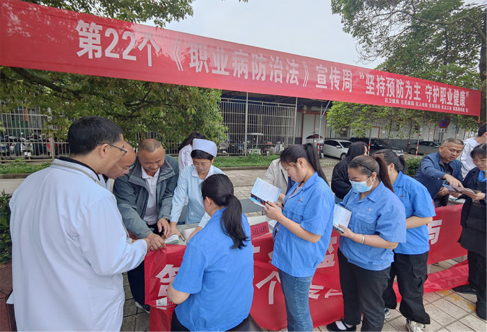4月25日,由乌当区卫健局联合区人社局、区民政局、区医保局、区总工会、高新路街道办事处等单位,在乌当区南通汇通高新技术工业园开展了第22个全国《职业病防治法》宣传周活动。